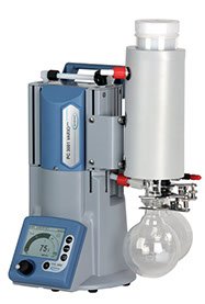 El puesto de bomba PC 3001 VARIOpro regula el vacío de forma precisa por medio de las revoluciones del motor de la bomba, de ahí que el controlador de vacío puede realizar una evaporación totalmente automática con solo apretar un botón. Su tamaño compacto y liviano hace que sea muy flexible su uso en el laboratorio. Gracias a la regulación del vacío por medio de las revoluciones, la bomba trabaja solamente cuando existe demanda de vacío. Por su marcha silenciosa hace que sea muy confortable trabajar con este equipo en el laboratorio. Como bomba básica la MD 1C VARIO-SP satisface elevadas exigencias inclusive con solventes de alto punto de ebullición. La trampa a la entrada de la bomba retiene partículas y gotas de solventes. El PC 3001 VARIOpro TE está equipado con una condensador a hielo seco a la salida de la bomba para laboratorios, donde no se dispone de conexiones de agua de refrigeración. A raíz de que la bomba trabaja solamente a demanda de vacío hace que las membranas tengan una aún mayor vida útil.