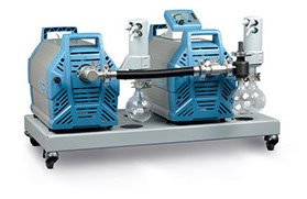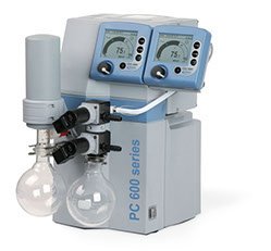 Puestos de bombas de estas series están bien probados para la generación y control de vacío de muchos procesos de evaporación. Este equipo hace posible trabajar con dos procesos de vacío de forma simultánea con solo una bomba. La bomba básica es una MD 4C NT versión química de cuatro etapas, para altos requerimientos de vacío para la mayoría de solventes con elevado punto de ebullición. El puesto de bomba está equipado con un controlador de vacío CVC 3000 con válvula electromagnética para su control electrónico del vacío. En la segunda conexión del vacío, una válvula de regulación manual del flujo, permite así regular de forma efectiva el caudal de aspiración en ese puerto. Ambos puertos de vacío tienen integradas válvulas de retención o antireflujo para evitar interferencias y contaminación cruzada.