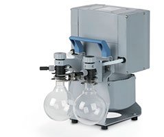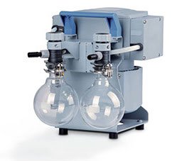 Este sistema de vacío versión química ofrece la ventaja de una alta capacidad de evacuación y un vacío final de hasta 70 mbar, ideal para la evacuación de grandes cantidades de gases y vapores. Posibilita una amplia gama de aplicaciones en laboratorios de química, biología y farmacia en la cual no hay requerimientos de condensación de vapores a la salida de la bomba. Típicas aplicaciones son estufas de secado, filtraciones individuales y múltiples como también la concentración de disolventes de bajo punto de ebullición. El separador o trampa de entrada (AK) de vidrio con recubrimiento protector, impide el ingreso de partículas y liquido. El separador o trampa de salida (EK) recoge los condensados y evita el reflujo hacia la bomba, además de eso absorbe el ruido del escape haciéndola aún más silenciosa.