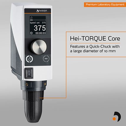 El gran diámetro del mandril (10 mm) le permite utilizar incluso grandes impulsores y herramientas VISCO JET®. Esto facilita una amplia variedad de aplicaciones, tales como la homogeneización, la dispersión, la disolución de aglomerados y más.